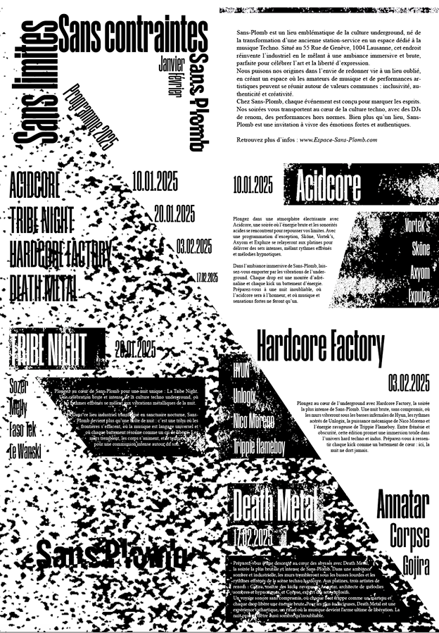 L’esthétique de Sans-Plomb est unique et bien reconnaissable. Je me suis inspirée de l’univers Techno / Tekno et underground. Tout est dans un style très brut. On ressent une grande inspiration de ma part pour le mouvement du “Brutalisme”.