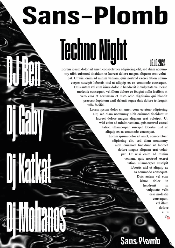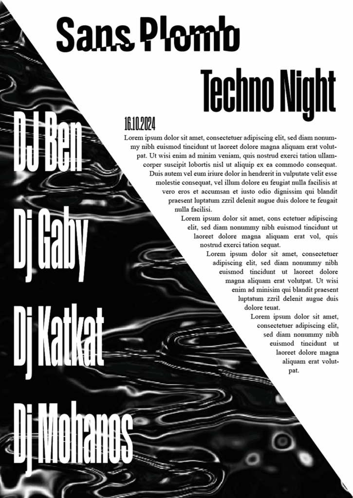 Cette troisième affiche est de nouveau en diagonale. Ce qui est très intéressant dans cette composition c’est cette diagonale, qui intrigue et la disposition des différents éléments. Les DJ sont mis en avant sur la texture.